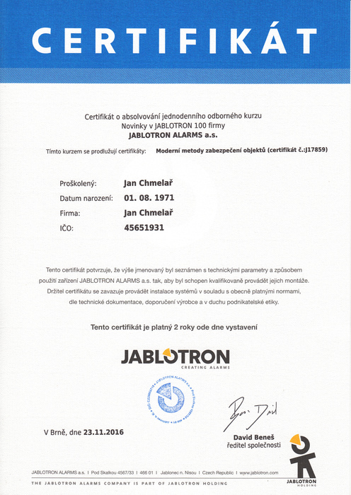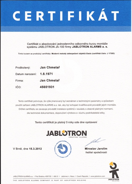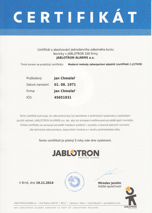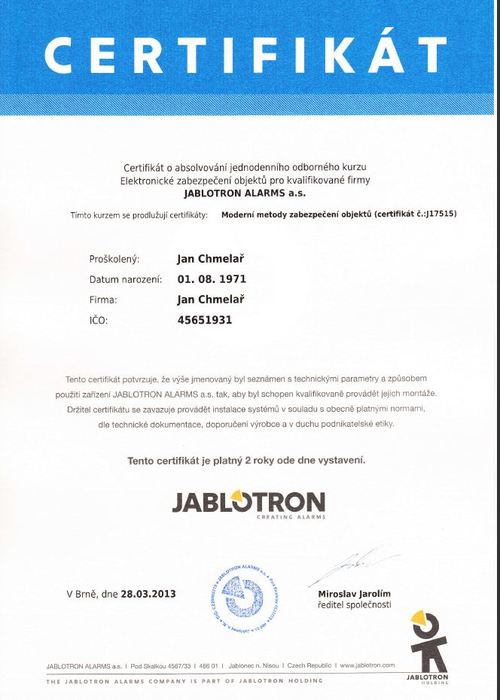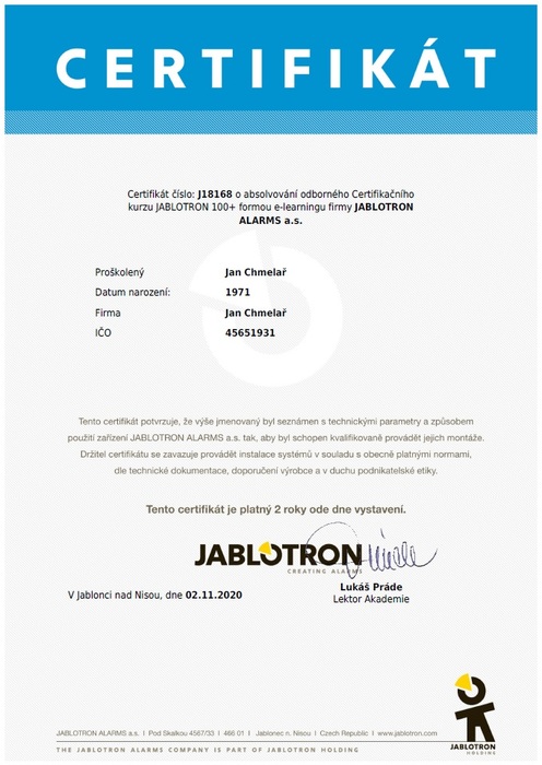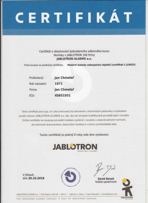 Rychlejší a jednodušší než pátrat po platnosti certifikátu zvažovaného dodavatele alarmu je ověřovací formulář na www.jablotron.cz