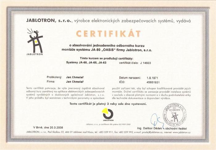 Nejsme, ani nikdy nechceme být držiteli certifikátů na bázi ISO. Jako všichni ostatní, kteří začínali již v "devadesátkách" víme, že jde pouze o nesmyslné vysávání peněz z firem a institucí a jejich zahlcování další zbytečnou administrativou. Tato kopie v USA celkem dobře fungujícího systému ověření kvality byla hezky česky překroucena na penězovod do bezedných kapes několika jedinců, které však kvalita absolutně nezajímá.